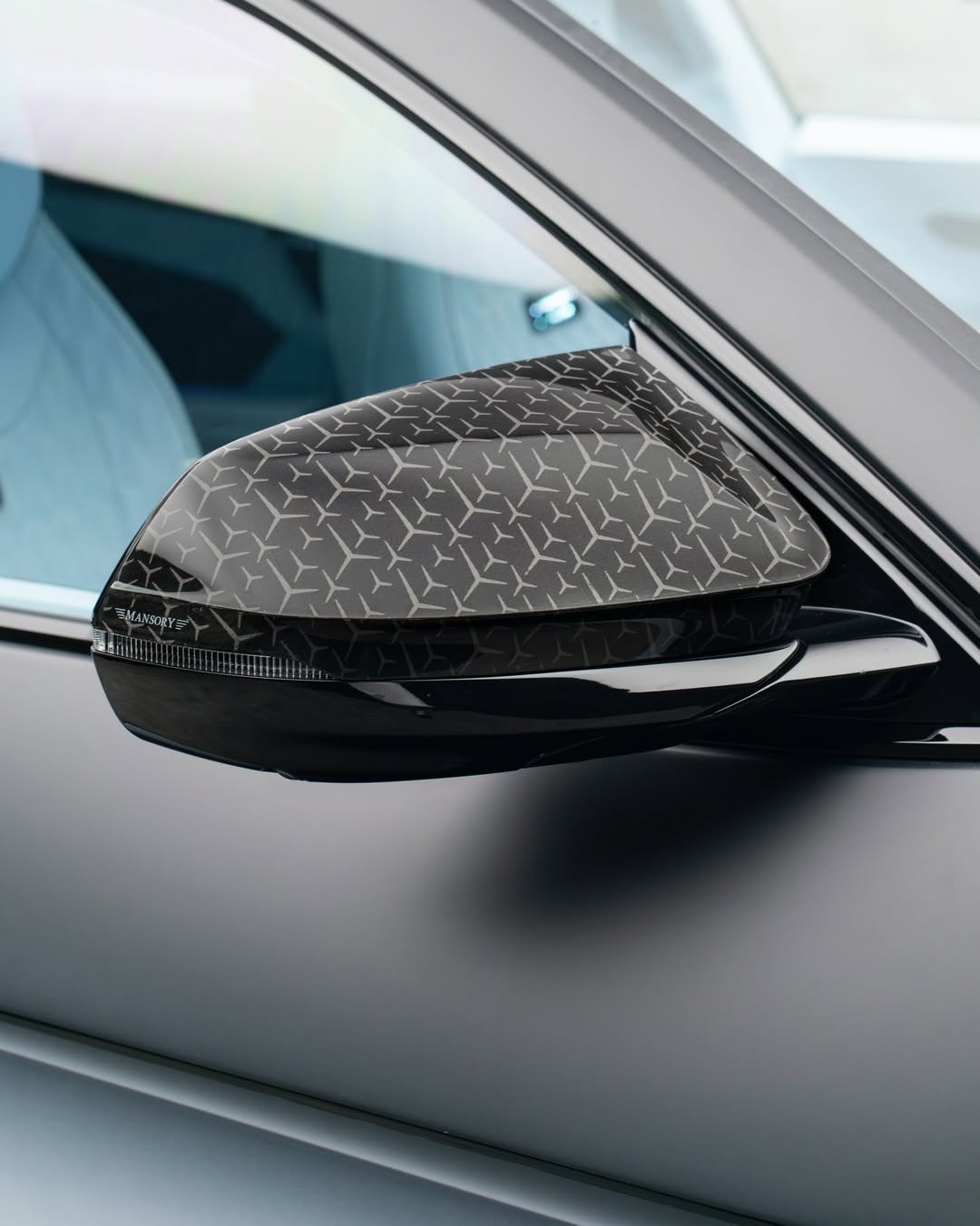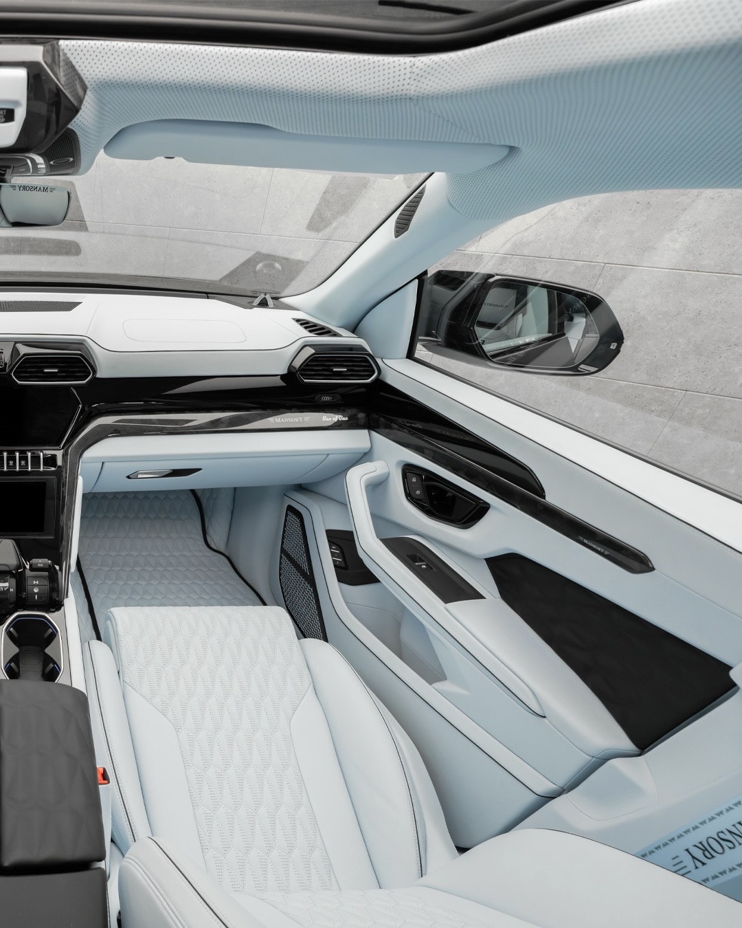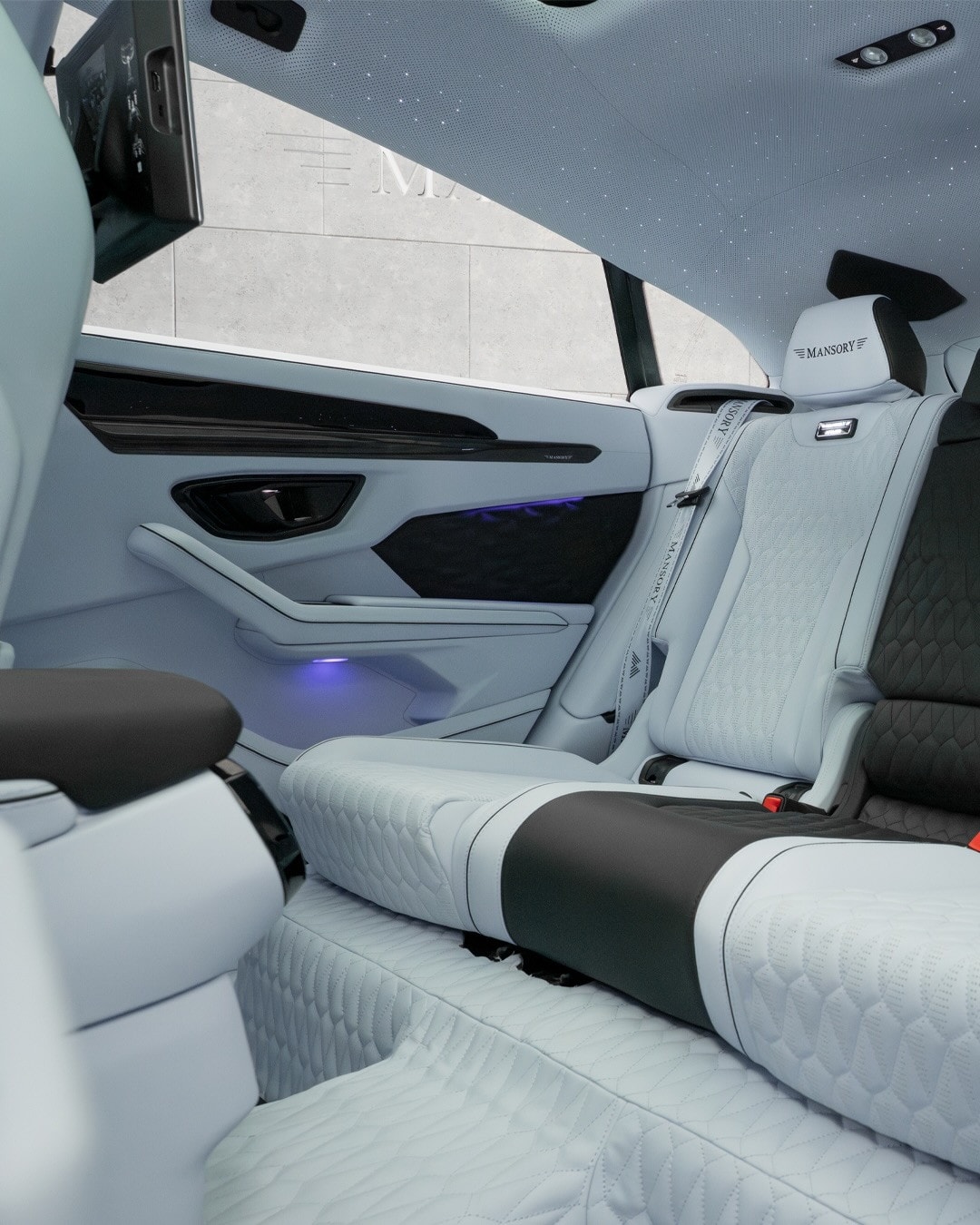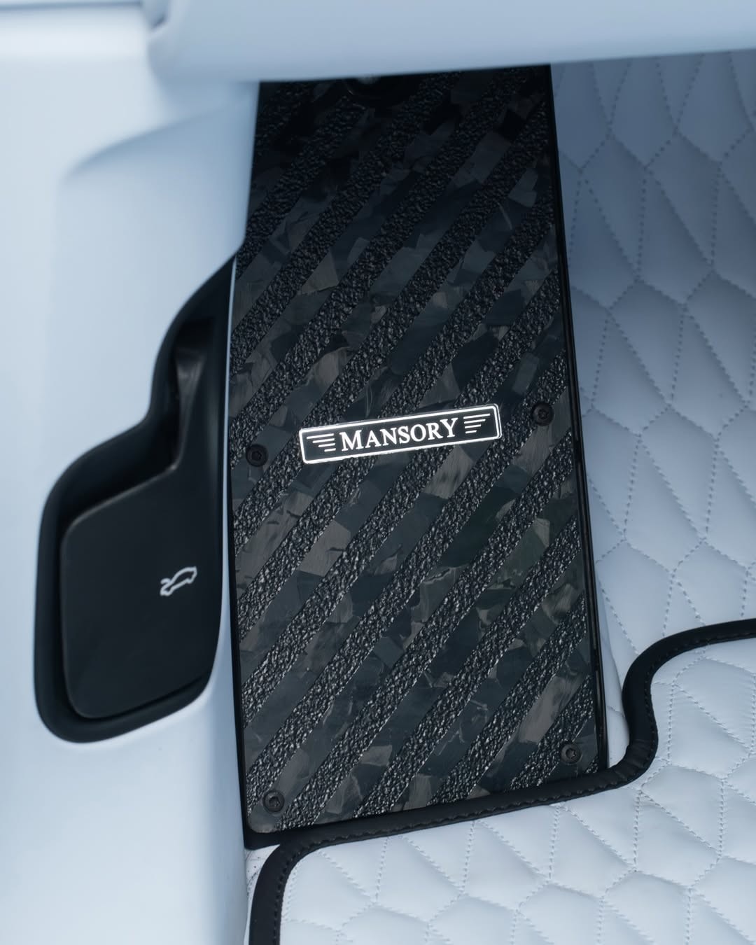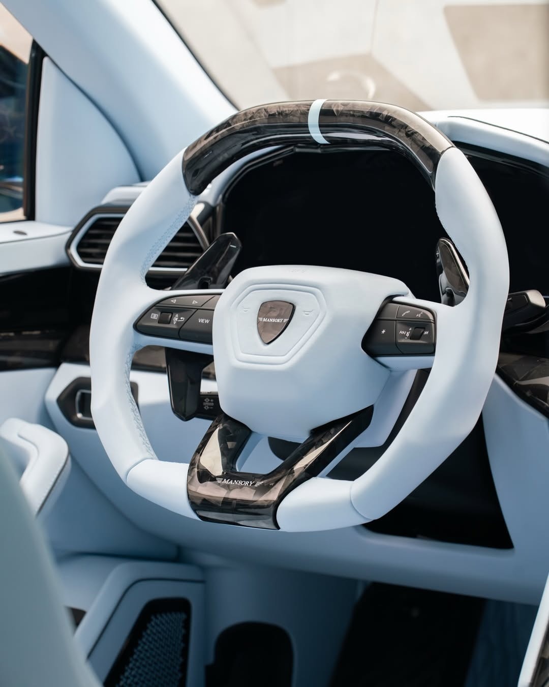 Inside, the color direction stays consistent. Light blue leather covers most surfaces, joined by black trim sections placed for contrast. Mansory logos appear across the cabin, including the seats and other upholstered areas. Black piping runs through the interior, together with glossy black accents and carbon fiber trim pieces. The cabin layout stays familiar, though the material mix shifts sharply from standard factory trim.